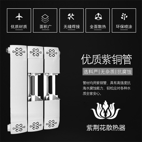 散熱器廠家紫荊花小編為大家分享一下: 1、經(jīng)濟性與裝飾性 由于銅、鋁的導(dǎo)熱性能非常好,故銅鋁復(fù)合暖氣片的散熱能力遠遠高于其它材料的暖氣片,其熱價比也遠高于其他材料的暖氣片。又由于銅、鋁均屬于有色金屬,它的價值是隨著時間而增長的,所以銅鋁復(fù)合暖氣片的保值率也遠高于其他材質(zhì)的暖氣片。 2、綜合機械性能 銅鋁型材以其強度高、水密性及氣密性好、導(dǎo)熱好、外觀精美、加工簡便在我國建筑業(yè)被廣泛應(yīng)用。尤其是其導(dǎo)熱性好的優(yōu)點近年來已被眾多暖氣片廠家重視。